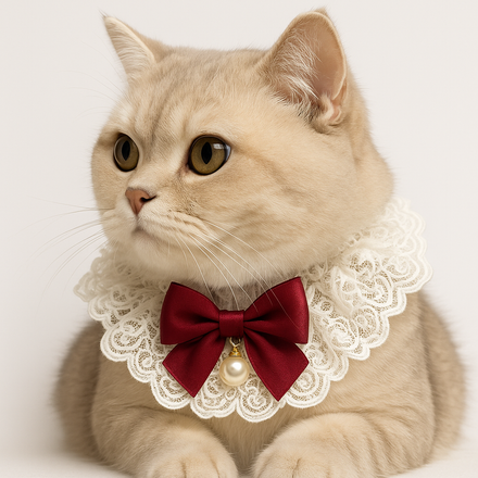 Luna is a 4-year-old rescue Maine Coon–mix who loves a little ceremony - her Luxe Pearl & Lace Bow Collar makes every cuddle feel royal.